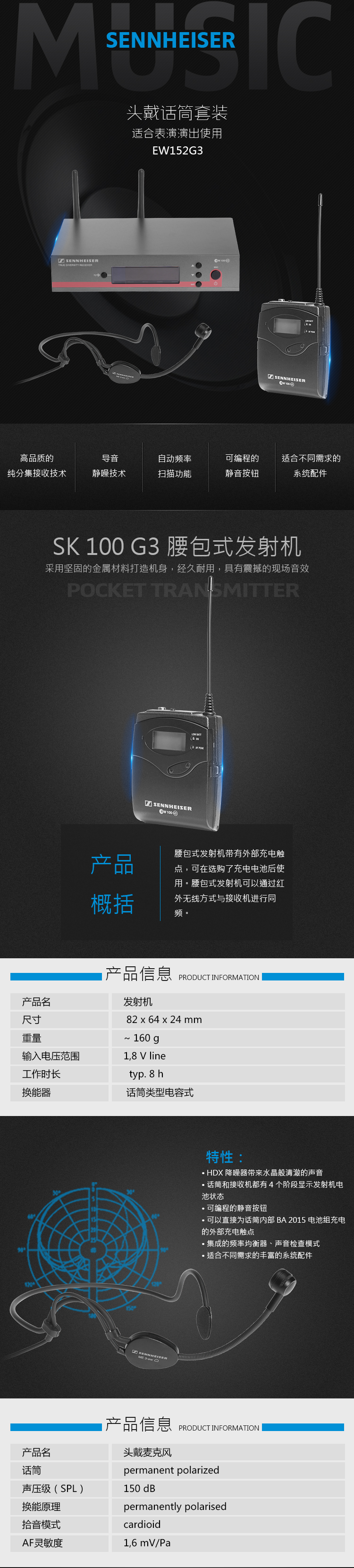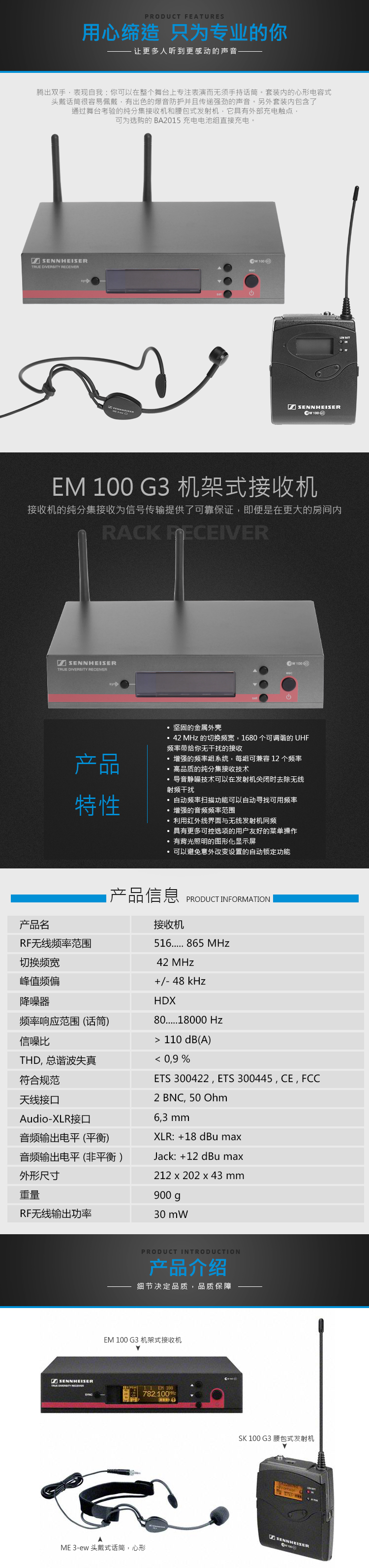 騰出雙手,表現(xiàn)自我:你可以在整個(gè)舞臺(tái)上專注表演而無須手持話筒。套裝內(nèi)的心形電容式頭戴話筒很容易佩戴,有出色的爆音防護(hù)并且傳遞強(qiáng)勁的聲音。另外套裝內(nèi)包含了通過舞臺(tái)考驗(yàn)的純分集接收機(jī)和腰包式發(fā)射機(jī),它具有外部充電觸點(diǎn),可為選購的BA2015 充電電池組直接充電。 特點(diǎn) 堅(jiān)固的金屬外殼 42 MHz 的切換頻寬,1680個(gè)可調(diào)諧的UHF頻率帶給你無干擾的接收 增強(qiáng)的頻率組系統(tǒng),每組最多12個(gè)兼容頻率 高品質(zhì)的純分集接收技術(shù) 導(dǎo)音靜噪技術(shù)可以在發(fā)射機(jī)關(guān)閉時(shí)去除無線射頻干擾